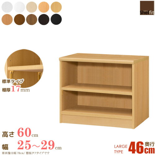 【サイズ】 ■奥行ラージ/棚板標準 タイプ 本体:幅25-29×奥行46×高さ60cm ※幅をお選び下さい 【材質】 本体:プリント紙化粧繊維板 塗装:ウレタン樹脂塗装 【商品仕様】 色:10色 [木目柄]ホワイトウッド、ライトナチュラル、ペアナチュラル、ナチュラル、ミディアムブラウン、ウォールナットブラウン、ブラウン、ダークブラウン/[無地]ホワイト、ブラック 移動棚1枚 棚板17mm厚(耐荷重10kg) ジョイントプレート付き ■棚板移動1.5cmピッチ ■幅木よけ加工済み ホルムアルデヒド放散区分:F★