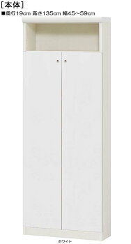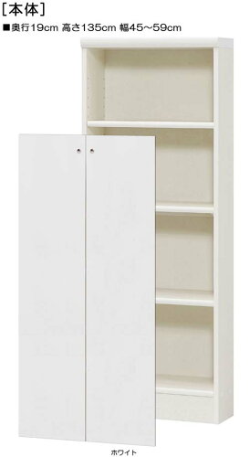 商品仕様 ■タイプ: 扉付 標準棚板(棚板厚さ1.7cm)タイプ 両開き ■棚板耐荷重: 4Kg ■外寸: 奥行19cm×高さ135cm×幅45〜59cm (幅は1cm単位でオーダーできます) ■外寸(幅): 45cm 46cm 47cm 48cm 49cm 50cm 51cm 52cm 53cm 54cm 55cm 56cm 57cm 58cm 59cm ■扉高(実寸): 109.5cm ■棚板枚数 移動棚板:2 移動固定棚板:1 共通仕様 ■材質: プリント化粧繊維板 ■塗装: ウレタン樹脂塗装 ■素材: ホルムアルデヒドの発生を最小限に抑えた基材・芯材・プリント紙・接着剤(F☆